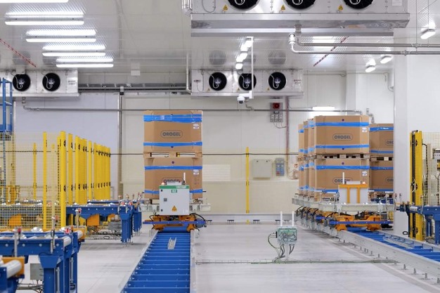 All'interno, l'anticella di movimentazione è composta da due piani, per 2.500 metri quadrati totali, temperatura controllata a +5°C, con sistemi di movimentazione avanzati senza personale. Al cuore dell'intero sistema, troviamo una centrale frigorifera con una capacità di raffreddamento di 4.500 kWf, abbinata a un potente impianto elettrico che utilizza l'energia dagli impianti di cogenerazione e fotovoltaico.