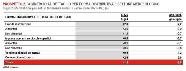 Rispetto a luglio 2024, il valore delle vendite al dettaglio è in aumento per tutti i canali di vendita: la grande distribuzione (+2,8%), le imprese operanti su piccole superfici (+0,6%), le vendite fuori dai negozi (+0,9%) e il commercio elettronico (+2,9%).