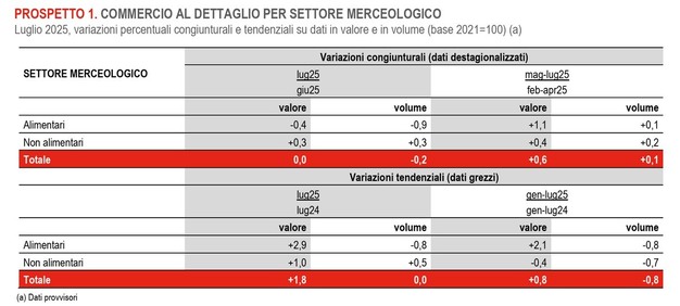 A luglio 2025 le vendite al dettaglio sono rimaste invariate in valore rispetto al mese precedente, mentre il volume è risultato in lieve calo (-0,2%). Le vendite dei beni alimentari sono in diminuzione (-0,4% in valore e -0,9% in volume), invece quelle dei beni non alimentari aumentano sia in valore sia in volume (+0,3%). A renderlo noto un comunicato dell'Istat-Istituto nazionale di statistica del 5 settembre 2025.