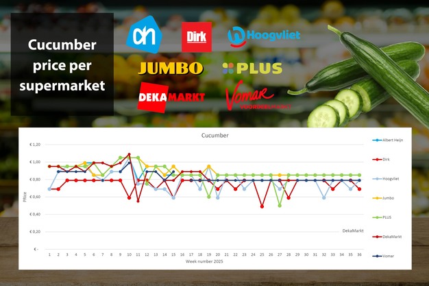 Dirk promuove i cetrioli nella settimana 36 e abbassa il prezzo di 10 centesimi, mentre la promozione di Hoogvliet della settimana 35 è terminata. Gli altri supermercati esaminati mantengono il prezzo stabile, per cui il prezzo medio rimane di 0,80 euro.
