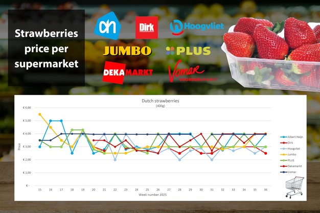 Dirk mette in evidenza le fragole con uno sconto di 50 centesimi, tuttavia le offerte di Albert Heijn e Hoogvliet sono terminate, con il prezzo medio che continua a salire e si attesta a 3,54 euro per 400 grammi.