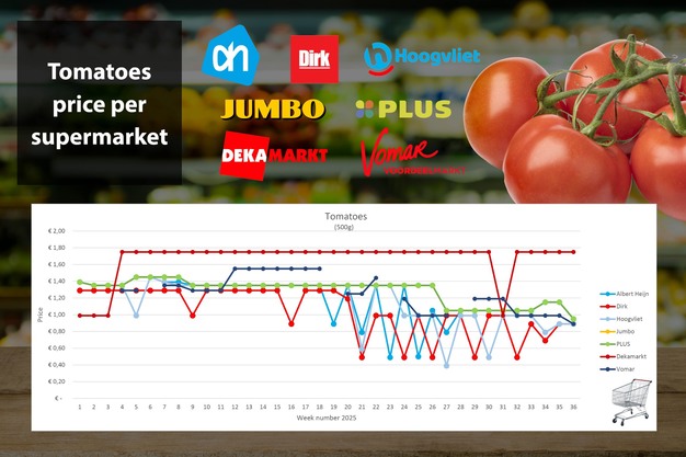 Numerose offerte sui pomodori a grappolo, sia da Albert Heijn sia da Plus (entrambi -20 centesimi), così come da Vomar (-10 centesimi). Ciò ha determinato un calo significativo del prezzo medio da 1,24 euro nella settimana 35 a 1,15 euro nella settimana 36.