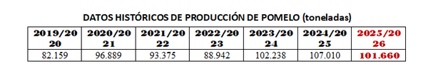 Per la prossima campagna 2025/26, la stima del raccolto di pompelmi di Ailimpo prevede una produzione in Spagna di 101.660 tonnellate, con un lieve calo del 5% rispetto al bilancio di produzione della campagna 2024/25, che si è conclusa con una produzione finale di 107.010 tonnellate, secondo il bilancio provvisorio che tiene conto della frutta esportata, trasformata e commercializzata sul mercato interno, nonché delle perdite di peso.