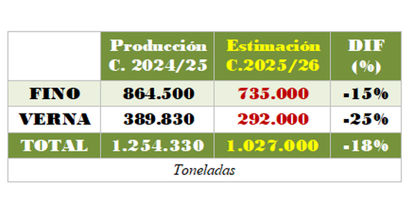 A livello varietale, nonostante la superficie coltivata totale rimanga pressoché invariata, intorno ai 50.000 ettari, si prevede un calo del 15% per la varietà Fino e del 25% per la varietà Verna, a causa degli effetti del cambiamento climatico che ha generato condizioni avverse nelle fasi di fioritura e allegagione, con un aumento significativo delle precipitazioni in primavera e temperature superiori alla media nel mese di giugno.