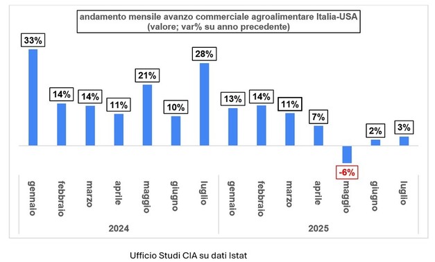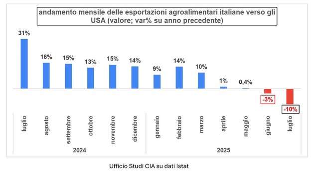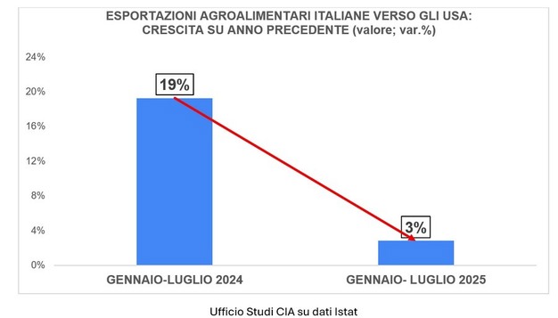 La tendenza negativa ha inciso sulla crescita cumulata di tutto il periodo gennaio-luglio 2025. Cia rileva, infatti, che nei primi sette mesi dell'anno l'aumento delle esportazioni è stato del 3%, mentre nello stesso periodo del 2024, l'incremento annuo era valso ben 19 punti percentuali.