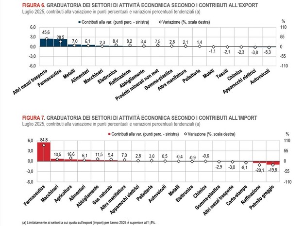 Nei primi sette mesi del 2025, l'export registra una crescita tendenziale del 2,9%, spiegata dalle maggiori vendite di articoli farmaceutici, chimico-medicinali e botanici (+37,2%), mezzi di trasporto, esclusi autoveicoli (+13,9%), prodotti alimentari, bevande e tabacco (+5,3%) e metalli di base e prodotti in metallo, esclusi macchine e impianti (+3,9%). Per tutti gli altri settori si rilevano diminuzioni nelle vendite: le più ampie per coke e prodotti petroliferi raffinati (-18,8%) e autoveicoli (-9,7%).