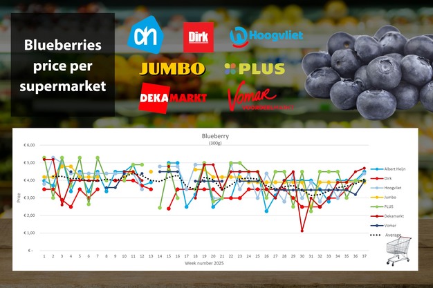 Un forte aumento sopra il prezzo medio settimanale dei mirtilli (+27 centesimi), causato soprattutto da notevoli rincari di Vomar (+76 centesimi), Albert Heijn e Hoogvliet (entrambi +50 centesimi) e DekaMarkt (+20 centesimi). Jumbo è l'eccezione, con una riduzione di prezzo di 10 centesimi a 3,89 euro per vaschetta da 300 grammi.