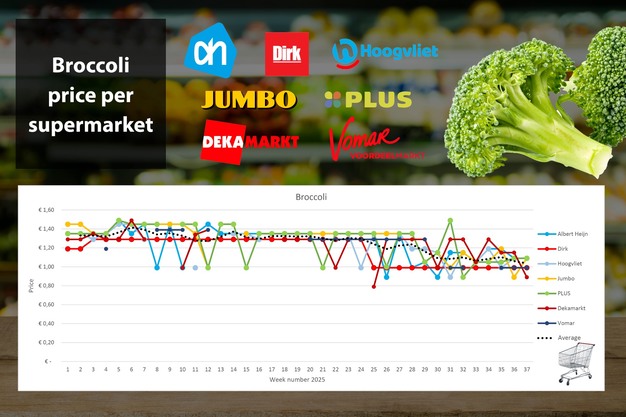 Il prezzo medio dei broccoli scende ancora leggermente nella settimana 37, perché DekaMarkt abbassa il prezzo di ben 26 centesimi. In questo modo detiene anche immediatamente il prezzo più basso. L'offerta di PLUS è terminata, la quotazione fissa torna a un livello inferiore (1,09 euro), con PLUS che si allinea ai prezzi online di Albert Heijn, Hoogvliet e Jumbo.
