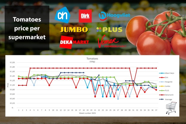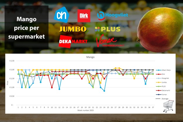 I dati sui prezzi provengono da Supermarktscanner.nl e si basano sui prezzi online nei negozi web di Albert Heijn, Jumbo, Plus, DekaMarkt, Dirk e Hoogvliet. Il prezzo riportato è una media che include anche le promozioni. In questa comparazione non si tiene conto di origine e qualità, poiché la maggior parte dei supermercati non fornisce queste informazioni sui propri siti. Solo Hoogvliet e Jumbo indicano il Paese d'origine. È quindi possibile che si confrontino, ad esempio, avocado acerbi con maturi, o cetrioli spagnoli con quelli olandesi.