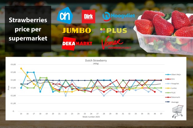 Dopo la promozione della settimana 36 di Dirk, Hoogvliet propone la stessa offerta nella settimana 37 (da 2,99 a 2,49 euro). Gli altri supermercati monitorati mantengono il prezzo stabile. Da Dirk, nella settimana 37, le fragole risultano assenti dallo scaffale online. Di conseguenza il prezzo medio aumenta di 8 centesimi.