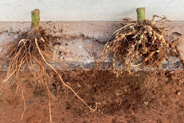 A sinistra Sanaterra a confronto con una varietà di riferimento con radici colpite dai nematodi