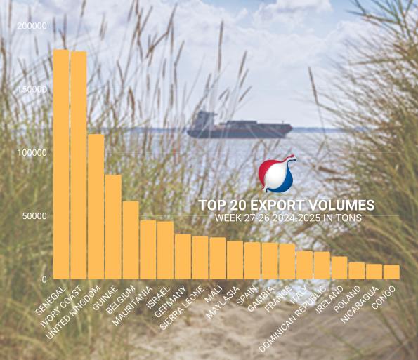 Sul mercato delle esportazioni, il Senegal è ancora una volta in testa alla classifica con oltre 181mila tonnellate. La Costa d'Avorio segue a breve distanza con quasi 180mila tonnellate, con una crescita del 77,5%. La Gran Bretagna si è mantenuta al terzo posto, sebbene le importazioni siano nuovamente diminuite (-14%). In particolare, Israele è salita al settimo posto con una crescita di quasi il 71%.