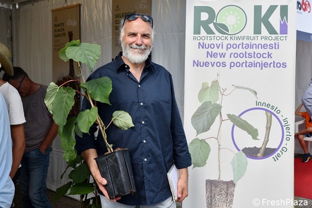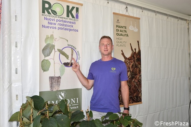 © Giancarlo Fabbri | FreshPlaza.itDavide Simeoni della Simeoni Kiwi Plant indica RoKi, un interessante portinnesto altamente compatibile con varietà di kiwi a polpa verde e la cui radice si mostra resistente alla "morìa". L'azienda vivaistica della famiglia Simeoni è attiva principalmente nel Friuli e in Veneto, dove le perdite negli actinidieti a causa della moria sono state particolarmente gravi, con punte superiori al 50%. Oggi il portinnesto RoKi (nome commerciale costruito dalle sillabe iniziali di Rootstock Kiwifruit) costituisce una risposta valida.