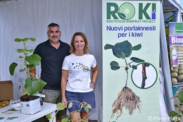 © Giancarlo Fabbri | FreshPlaza.itCorrado Arigliani e Daniela Magalotti presso lo stand allestito dagli omonimi Vivai Magalotti. Anche qui il portinnesto RoKi, selezionato da breeder italiani, è stato protagonista. L'azienda vivaistica lo distribuisce sin dal 2022-2023 negli areali piemontesi e in provincia di Latina. Dal prossimo anno si comincerà a impiantare kiwi Hayward su portinnesto RoKi anche all'estero (Francia, Spagna e Portogallo).