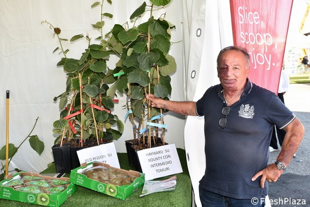 © Giancarlo Fabbri | FreshPlaza.it Maurizio Dal Pane mostra un innesto di kiwi verde Hayward su Bounty con intermedio Tomuri.