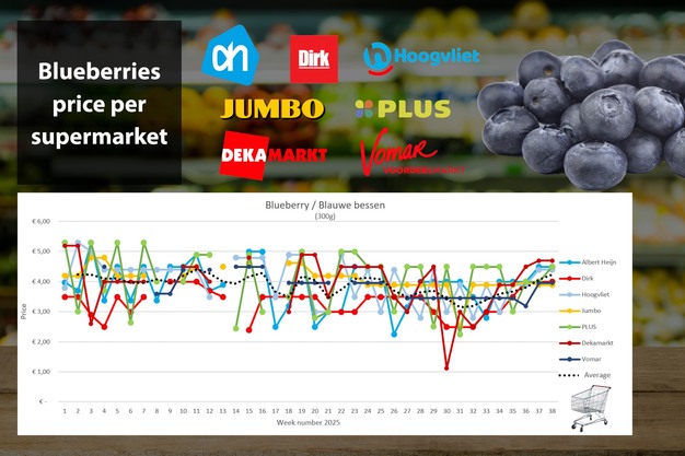 Un aumento di 50 centesimi da parte di PLUS fa salire ulteriormente il livello medio di prezzo per 300 g di mirtilli. Nella settimana 38 si attesta a 4,27 euro. Jumbo continua invece a proporre, soprattutto rispetto agli altri supermercati nazionali, una quotazione sorprendentemente bassa: 3,89 euro.