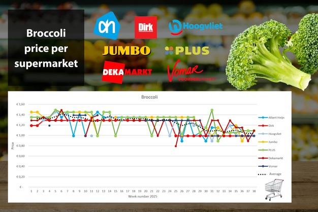 Il prezzo medio dei broccoli sembra stabilizzarsi. Hoogvliet applica una riduzione di 10 centesimi, mentre DekaMarkt aumenta il prezzo di 20 centesimi. Di conseguenza, il prezzo medio dei broccoli si attesta a 1,05 euro, cioè 2 centesimi in più rispetto alla settimana 37.