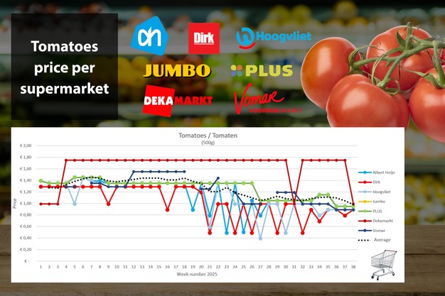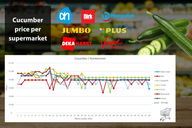 I dati sui prezzi provengono da Supermarktscanner.nl e si basano sui prezzi online nei negozi web di Albert Heijn, Jumbo, Plus, DekaMarkt, Dirk e Hoogvliet. Il prezzo riportato è una media che include anche le promozioni. In questa comparazione non si tiene conto di origine e qualità, poiché la maggior parte dei supermercati non fornisce queste informazioni sui propri siti. Solo Hoogvliet e Jumbo indicano il Paese d'origine. È quindi possibile che si confrontino, ad esempio, avocado acerbi con maturi, o cetrioli spagnoli con quelli olandesi.