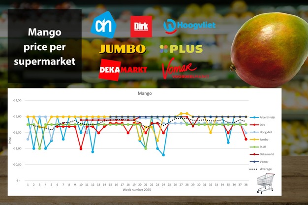 Nelle ultime settimane c'è stato poco movimento sul fronte del prezzo del mango, ma nella settimana 38 sia Dirk sia Hoogvliet scelgono di metterlo in offerta. Lo sconto applicato è rispettivamente di 50 e 30 centesimi.