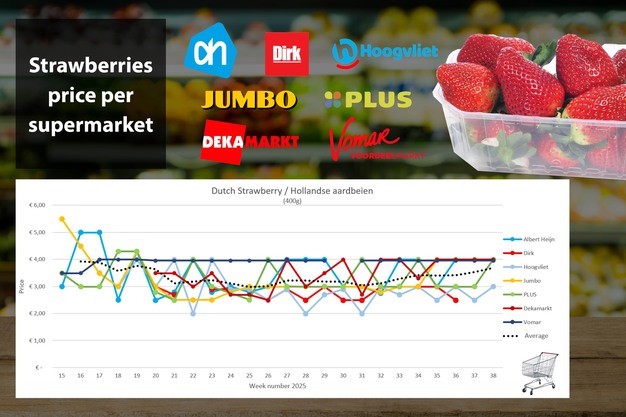 Le promozioni della settimana 37 da Hoogvliet e Plus sono terminate e nella settimana 38 nessun supermercato propone fragole in offerta. Questo fa salire sensibilmente il prezzo medio a 3,82 euro per 400 g. Da notare: per la seconda settimana consecutiva Dirk non ha fragole disponibili online.