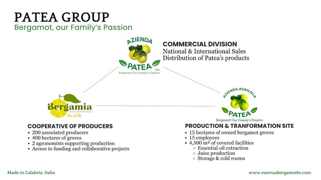 Il gruppo oggi conta tre realtà: la Cooperativa agricola Bergamia, che riunisce oltre 200 produttori e garantisce la disponibilità del frutto fresco; l'azienda agricola Patea, cuore della trasformazione con impianti dedicati alla lavorazione di oli essenziali, succhi e liquori; e la nuova Patea Srl, focalizzata sulla distribuzione e sullo sviluppo commerciale.