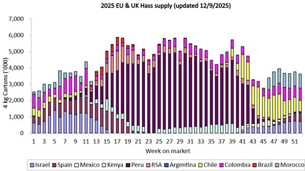 Il Sudafrica si trova ora nella fase finale della fornitura. "Alcune delle richieste di esportazione vengono soddisfatte dalla varietà Lamb Hass, che tende a maturare più tardi. Questa settimana (la 39 del 2025, ndr) la frutta viene raccolta nella regione di Kiepersol. Siamo soddisfatti della fornitura dal Sudafrica in questa stagione, con volumi costanti forniti durante la maggior parte della stagione. In generale, la programmazione e la spedizione sono avvenute senza intoppi".