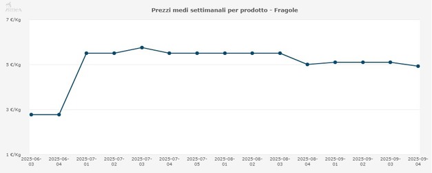 Nella terza settimana di settembre 2025, i prezzi all'origine delle fragole si sono attestati sui 5,10 €/kg, secondo le rilevazioni Ismea. Si tratta di un livello in linea con quello registrato nella settimana precedente, a conferma di una fase di sostanziale stabilità che caratterizza il mercato da fine agosto. Il mercato delle fragole chiude invece la quarta settimana di settembre con un nuovo segnale di debolezza: i prezzi medi all'origine si sono attestati a 4,93 €/kg, in flessione del 3,3% rispetto alla settimana precedente.