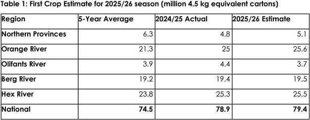 L'industria sudafricana dell'uva da tavola ha pubblicato le sue prime stime sul raccolto per la stagione 2025/26, prevedendo una produzione di 79,4 milioni di cartoni. La stima fissa un limite minimo di 77,0 milioni di cartoni e un limite massimo di 81,7 milioni di cartoni.