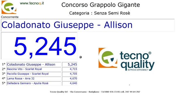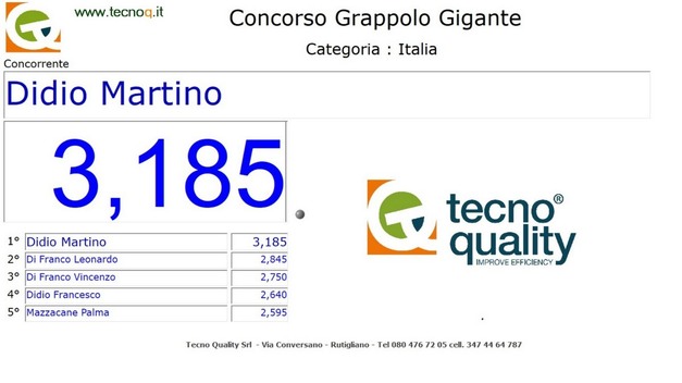 Per l'uva Italia, a essere premiata è stata invece l'azienda di Didio Martino (socio Op APOC), con un grappolo dal peso di 3,185 kg (lo scorso anno era 3,875 kg). Sul podio anche gli imprenditori Leonardo Di Franco con 2,845 kg e Vincenzo Di Franco con 2,750 kg.
