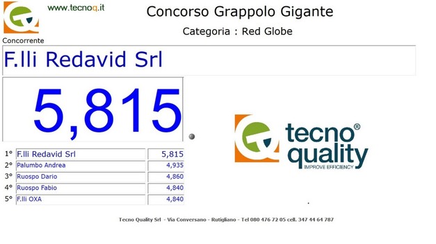 Per la varietà Red Globe, il grappolo vincitore pesa 5,815 kg dell'azienda F.lli Redavid Srl, simile dunque a quello dell'anno precedente (5,880 kg). Il produttore Palumbo Andrea si è invece aggiudicato il terzo posto con un grappolo del peso di 4,935 kg, mentre la terza posizione è andata a Dario Ruospo con 4,860 kg.