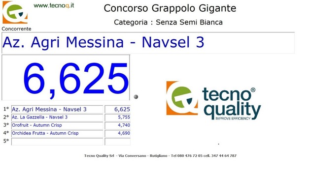 Nella categoria bianca senza semi si registra un picco massimo di 6,625 kg con la varietà Navsel-3, un dato in crescita rispetto al peso massimo registrato l'anno precedente (Nel 2024 infatti era 5,755 kg). Ad aggiudicarsi il primo posto è stata l'azienda Agri Messina, seguita dall'azienda agricola La Gazzella, socia della Op APOC, con un peso pari a 5,755 kg (sempre varietà Navsel-3) e infine Orofruit con 4,740 kg (varietà Autumn Crisp).