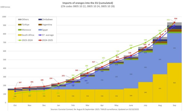 Da ottobre 2024 a settembre 2025 le importazioni di arance nell'Ue hanno raggiunto le 934.334 tonnellate, quasi identiche alle 933.497 tonnellate registrate nella campagna 2023/24 e leggermente superiori alla media quinquennale di 897.146 tonnellate.