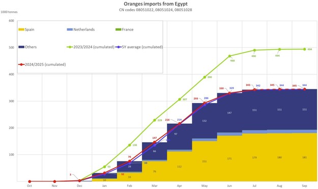 Le spedizioni dall'Egitto sono scese ben al di sotto dei livelli degli ultimi anni. Le importazioni hanno raggiunto un totale di 345.054 tonnellate, con un calo del 30% rispetto alla campagna 2023/24, al di sotto, inoltre, della media quinquennale di 343.880 tonnellate. I cali più significativi si sono verificati a marzo (44% in meno rispetto all'anno precedente) e luglio (50% in meno).