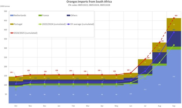 Le esportazioni di arance sudafricane verso l'Ue sono aumentate a 463.263 tonnellate, con un incremento del 46% rispetto alla stagione 2023/24 e del 20% rispetto alla media quinquennale di 386.934 tonnellate. Le spedizioni hanno registrato un'accelerazione a partire da giugno, con volumi a settembre pari a 132.443 tonnellate rispetto alle 94.905 tonnellate di settembre 2023.