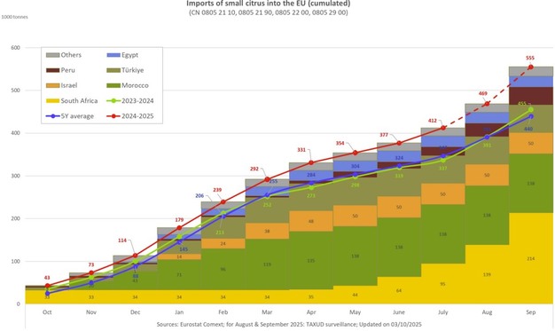 Le importazioni di mandarini sono aumentate notevolmente, raggiungendo le 555.155 tonnellate rispetto alle 482.189 tonnellate della campagna 2023/24 e alla media quinquennale di 439.592 tonnellate. Il Sudafrica è stato il principale fornitore con 213.654 tonnellate, seguito dal Marocco con 137.945 tonnellate, oltre l'80% in più rispetto alla stagione precedente. La Turchia ha spedito 64.120 tonnellate, il Perù 42.387 tonnellate e l'Egitto 25.374 tonnellate.