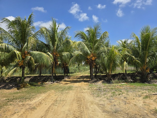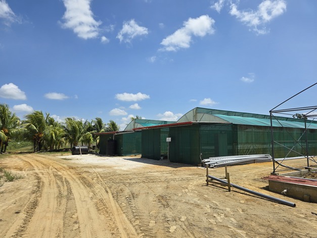 Palme dietro le serre e l'ufficio. Dietro di esse si trova la coltivazione su larga scala di okra