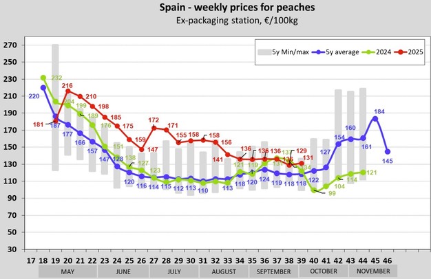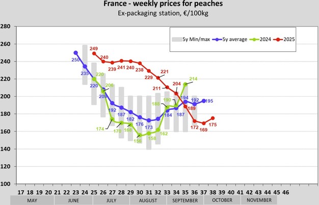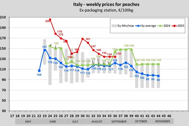In Europa i prezzi delle pesche hanno registrato andamenti diversi nelle settimane dalla 37 alla 39 della stagione 2025.
