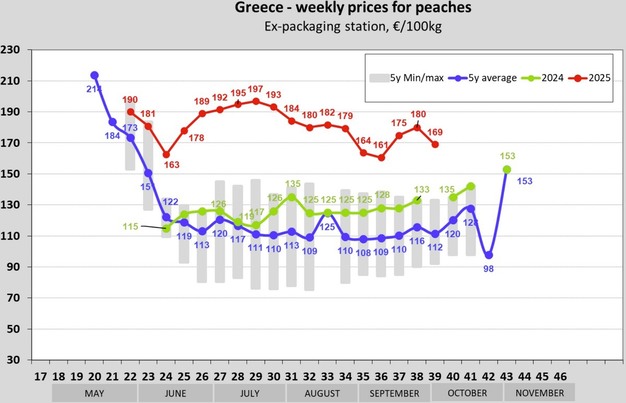 In Grecia i prezzi si sono attestati a 175 €/100 kg nella settimana 37, salendo a 180 € nella settimana 38 prima di scendere nuovamente a 169 € nella settimana 39. Nonostante il calo, i valori rimangono ben al di sopra sia della media quinquennale che dei livelli del 2024, riflettendo la forte domanda durante il periodo considerato.