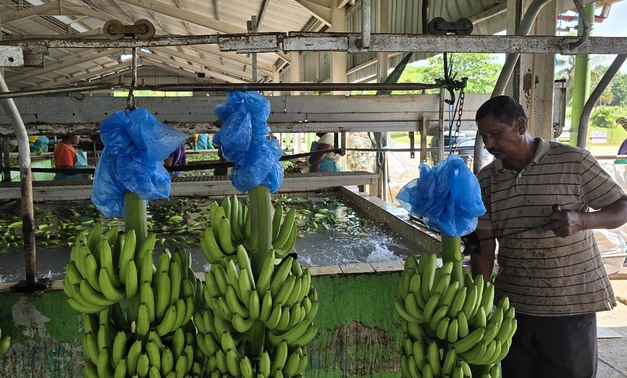 I caschi di banane vengono separati dal ramo e immersi in una vasca d'acqua contenente lattice