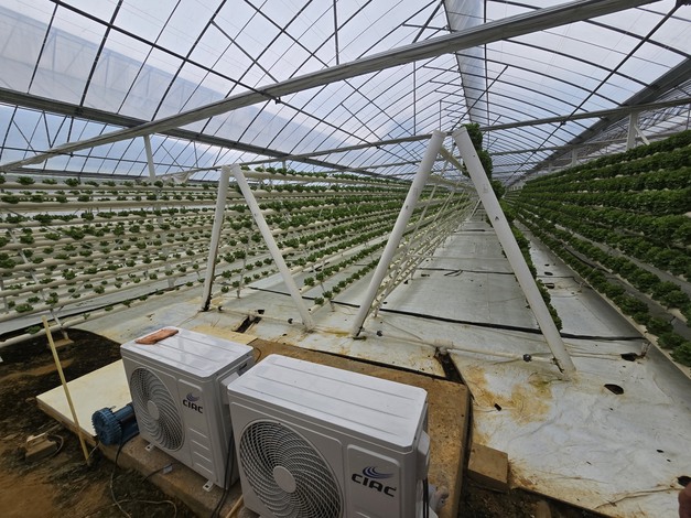Nella nuova serra, il sistema a piramide è stato sostituito da canalette di coltivazione; in primo piano si vedono i refrigeratori d'acqua