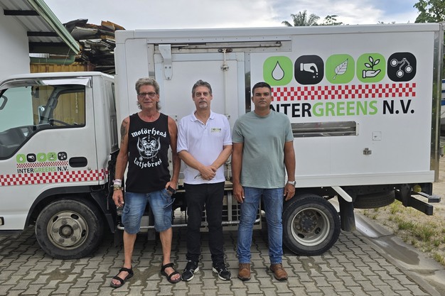 Da sinistra a destra: Bas Slagter, coltivatore olandese di cavolfiori in pensione, ma attualmente attivo in Suriname attraverso la fondazione PUM per fornire supporto e consulenza nel settore agricolo; Marnix Maenhoudt, fondatore e proprietario di Intergreens NV; Kenny van Dijk, imprenditore surinamese nel settore agricolo e delle macchine agricole. Alle loro spalle, il camion refrigerato con cui viene effettuata la consegna