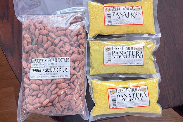 © Terre di Sicilia S.R.L.S. In foto, mandorle sgusciate e tra le ovità di prodotto una speciale panatura biologica al limone, disponibile anche nella versione al pistacchio. per farcire soprattutto varie tipologie di carne.