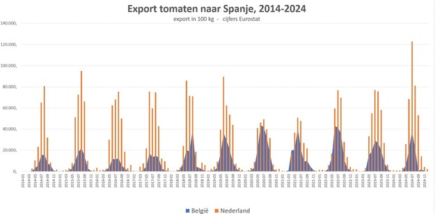 Esportazioni di pomodori da Belgio e Paesi Bassi verso la Spagna, 2014-2024. Clicca qui per ingrandire.