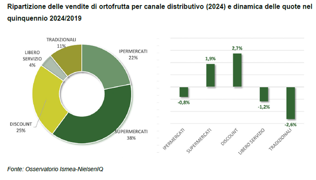 Due macrotendenze, strettamente interconnesse, stanno ridefinendo il panorama distributivo: l'ascesa del discount e il successo del prodotto confezionato. Il discount ha consolidato il suo ruolo, diventando un attore chiave per l'acquisto di ortofrutta. La sua quota di mercato ha raggiunto il 25% del valore totale delle vendite, a riprova di come il fattore convenienza sia diventato una leva decisionale primaria per un'ampia fascia di consumatori. Il prodotto fresco a peso fisso, con codice EAN, guadagna terreno a scapito dello sfuso. Il successo di questo formato è spinto da una sinergia di fattori: efficienza logistica per la distribuzione, percezione di maggiore igiene da parte del consumatore e, come evidenziato, l'affermazione del modello discount che predilige la gestione del reparto attraverso queste referenze.