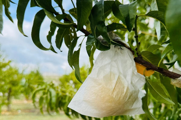 Ogni albero produce generosamente 50 kg circa, e ogni frutto pesa 200/250 grammi circa. I fiori di pesco sbocciano in primavera, il panorama delle coltivazioni si profuma e l'albero si veste di bellezza. Quando i fiori diventano piccoli frutti, tra maggio e luglio, inizia l'insacchettamento con carta pergamenata, che protegge ogni singola piccola pesca lungo il periodo di maturazione da stress patogeni e atmosferici che potrebbero danneggiarla durante la crescita. L'uso del sacchetto consente ai peschicoltori di non ricorrere a ulteriori trattamenti chimici, proteggendo naturalmente il frutto dalla polpa gialla o bianca che raggiunge un ottimo calibro (circa AA-AAA) sfoggiando una qualità estetica straordinaria, nel pieno rispetto della biodiversità, dell'identità territoriale e della sostenibilità ambientale. Il sole riesce comunque a filtrare attraverso la pergamena, accarezzando la vellutata buccia che in piena maturazione si colora di bianco, giallo e rosso.