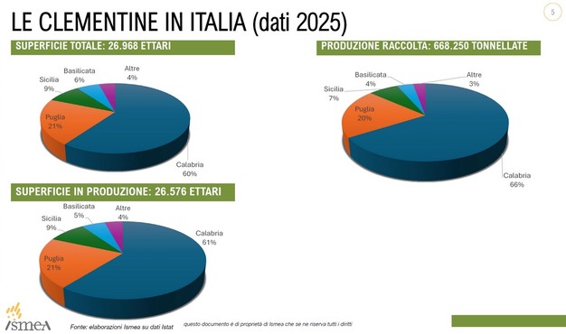 "I dati 2025 sull'Italia mostrano una superficie totale di 36.100 ettari destinata ai piccoli agrumi, con 26.968 ettari specificamente dedicati alle clementine. Circa l'81% della produzione raccolta totale è composto da clementine – ha continuato Schiano – All'interno di questo quadro nazionale, la Calabria si afferma come il baricentro produttivo nazionale, la cui performance determina di fatto la competitività dell'intera offerta italiana. La Regione produce i 2/3 di tutte le clementine italiane. Negli ultimi 10 anni, la superficie dedicata è rimasta stabile, attestandosi intorno ai 16.000 ettari. Negli ultimi 5 anni, la produzione calabrese si è assestata su circa 450mila tonnellate, pur presentando oscillazioni dovute a fattori climatici". La provincia di Cosenza (12.350 ettari) è leader nazionale, seguita a grande distanza da Taranto in Puglia (5.600 ettari) e Reggio Calabria (2.350 ettari).