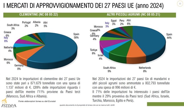 Nel 2024, le esportazioni dell'Ue-27 sono ammontate a circa 1,4 milioni di tonnellate e per l'82% erano dirette a nazioni dell'Ue e per il 18% ai Paesi extra-Ue. Nello stesso anno, i 27 Paesi dell'Ue hanno importato circa 1,7 milioni di tonnellate di piccoli agrumi. L'80% di questo quantitativo è relativo a scambi intra-europei mentre il restante 20% a importazioni da Paesi terzi all'Ue. In particolare, gli scambi dell'Ue con i Paesi terzi nel 2024 hanno registrato esportazioni per 250mila tonnellate e importazioni per 335mila tonnellate, con un deficit di circa 84mila tonnellate. In termini di valore, il saldo dei 27 Paesi Ue è di meno 78 milioni di euro, come conseguenza di 315 milioni di euro di esportazioni e di 394 milioni di euro di importazioni.