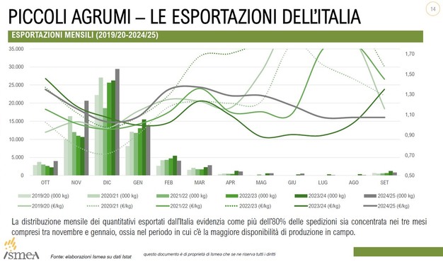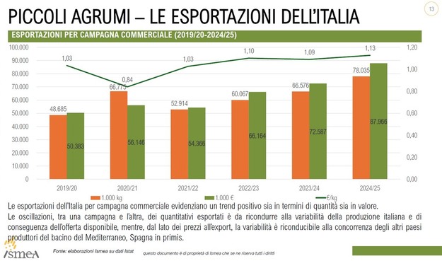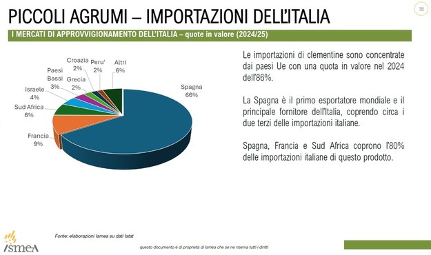 Dopo aver esaminato il contesto generale europeo, Schiano si è focalizzato sulla performance specifica dell'Italia nel commercio con l'estero. Il trend recente delle esportazioni italiane di clementine è molto incoraggiante, mostrando una crescita in termini sia di quantità sia di valore. "Recentemente, gli introiti derivanti dalle vendite all'estero hanno raggiunto circa 88 milioni di euro, un dato che testimonia la capacità del prodotto di affermarsi sui mercati. Tuttavia, dal punto di vista del prezzo, si palesa una criticità strutturale: l'Italia si trova in una posizione 'subalterna' rispetto alla Spagna. Essendo quest'ultima il principale player europeo, di fatto ne determina i livelli di prezzo, costringendo gli operatori italiani ad adattarsi a un mercato che non governano".