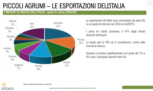 L'Italia ha sviluppato una buona diversificazione dei propri mercati di destinazione, sebbene permangano aree di potenziale non ancora sfruttato. La Germania è il primo mercato (21%), ma con una quota inferiore rispetto ad altri prodotti ortofrutticoli, indicando una buona diversificazione. Ottima la presenza in Est Europa, con la Polonia (14%) come secondo cliente, seguita da Ungheria, Slovenia e Romania. L'Austria rappresenta una quota del 12%. Svizzera e Ucraina rispettivamente con quote del 7 e del 6% sono i principali sbocchi extra-Ue. Il Regno Unito è stato definito da Schiano come "il grande assente". "Rappresenta un'opportunità di crescita significativa, attualmente dominata dalla Spagna".
