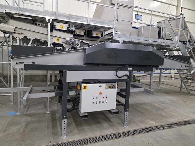 "Poter regolare l'altezza di caduta alla fine della linea di selezione, durante il riempimento delle casse, è un metodo affidabile per ridurre i danni ai prodotti. La nostra macchina DBF (Dynamic Box Filling) rappresenta una soluzione avanzata per un riempimento delicato e uniforme, rispettando la fragilità dei prodotti. È dotata di bracci regolabili idraulicamente e sensori integrati che garantiscono un'altezza di caduta minima per l'intero processo di riempimento. La tecnologia mantiene costantemente l'altezza di caduta più bassa possibile. I prodotti vengono alimentati su un nastro trasportatore mobile che li deposita delicatamente nella cassa. Quando il prodotto viene rilevato da un sensore fotoelettrico, il nastro si solleva automaticamente per evitare danni", spiega Tomáš Zdráhal, responsabile alle vendite di zona del produttore ceco di macchinari Htech cz s.r.o.